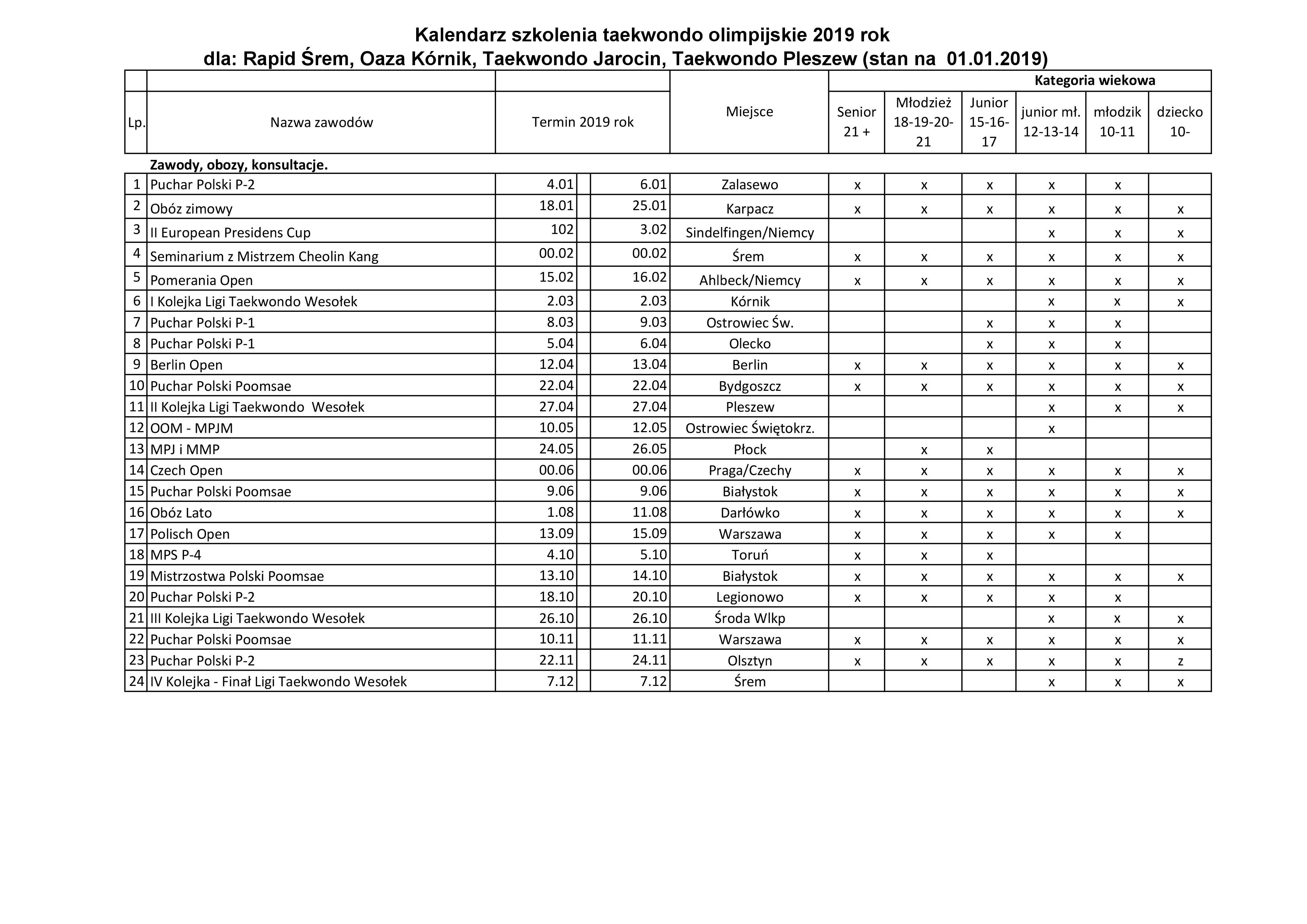 Kalendarz startów, konsultacji, obozów 2019 rok