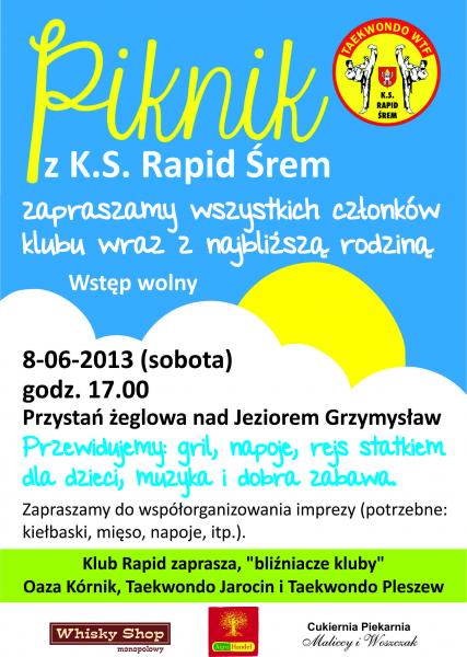 W dniu 8.06.2013 o godz. 17.00 zapraszamy na piknik klubowy. Piknik sponsorują: Agro Handel, Whisky Shop, Cukiernia Piekarnia Maliccy i Woszczak